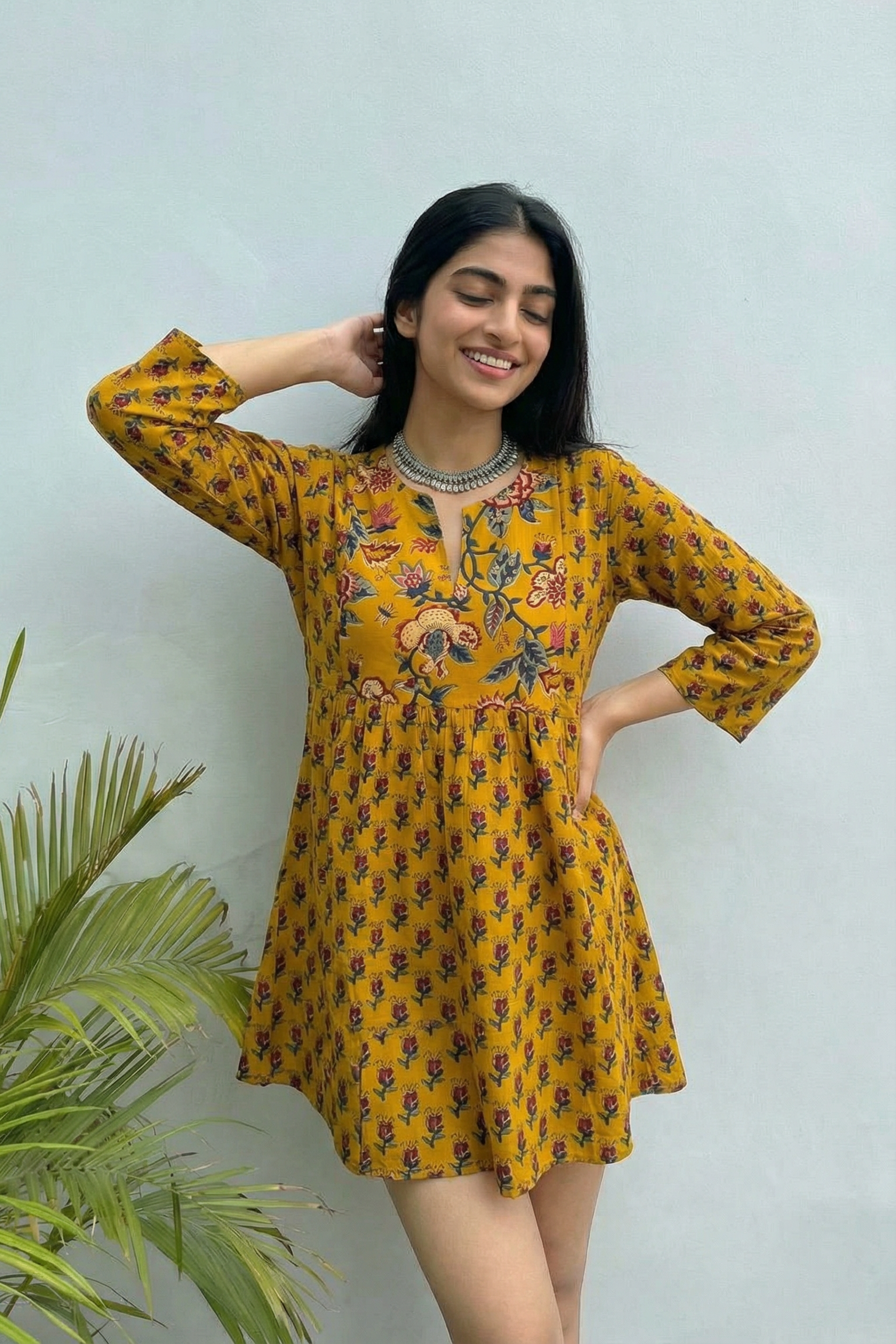 Add a vibrant touch to your wardrobe with our Golden Meadow Bloom Dress, beautifully crafted in premium 60×60 cotton. Featuring a warm mustard-yellow base adorned with delicate floral prints and statement botanical motifs on the bodice, this dress radiates charm and graceful elegance.