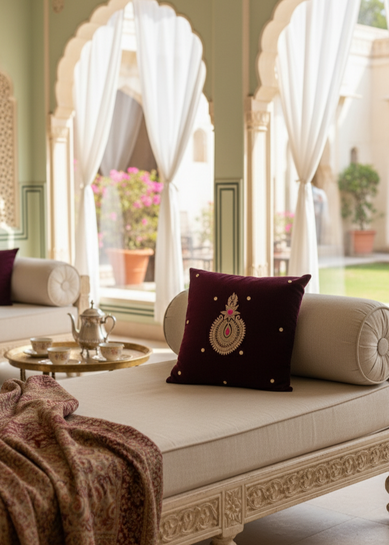 A perfect blend of royal artistry and modern aesthetics. Each cushion cover is handmade, offering a unique design that complements your sofa, couch, or bedroom setup.