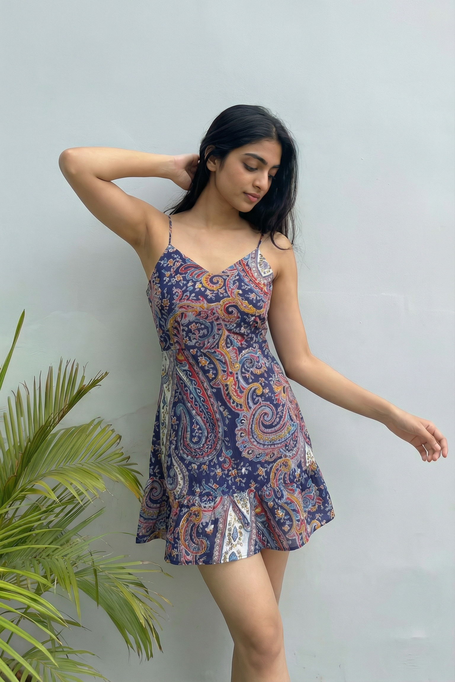 The delicate spaghetti straps and flattering V-neckline enhance the neckline beautifully, while the open back with adjustable tie detail adds a subtle yet stunning touch of allure. The flared hemline gives it a soft, flowy movement — making it perfect for twirls, brunches, and sunset evenings.