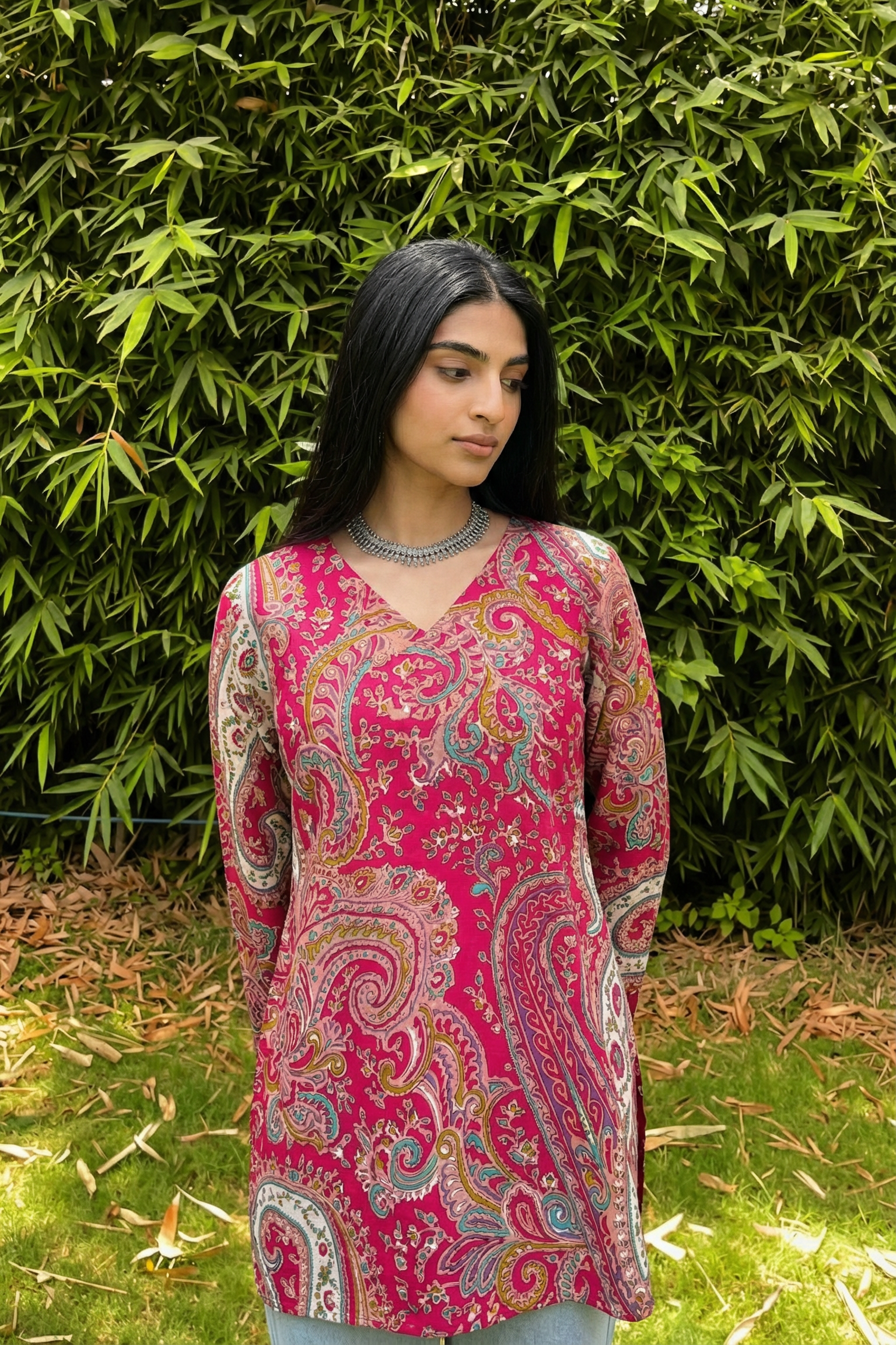 Step into timeless elegance with our Rani Paisley Grace Dress, a beautiful fusion of traditional paisley artistry and modern silhouette. Featuring a rich rani pink base adorned with intricate multicolor paisley prints, this dress radiates feminine charm and sophistication.